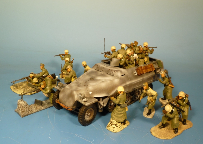 Unser Modell zeigt einen Schützenpanzer Sd. Kfz. 251/1 beim Angriff mit aufgesessener Infanterie im Winter.